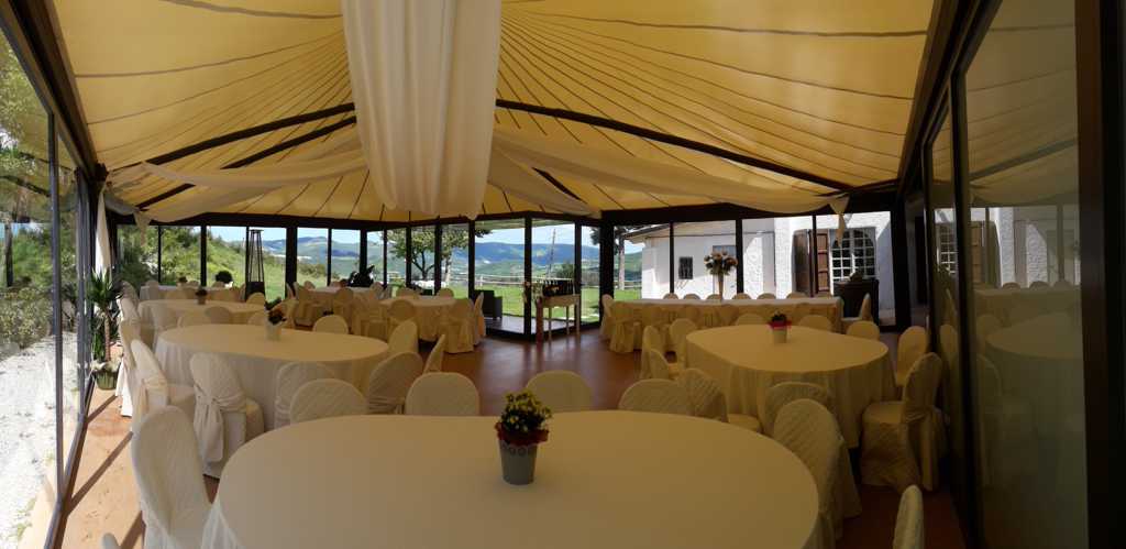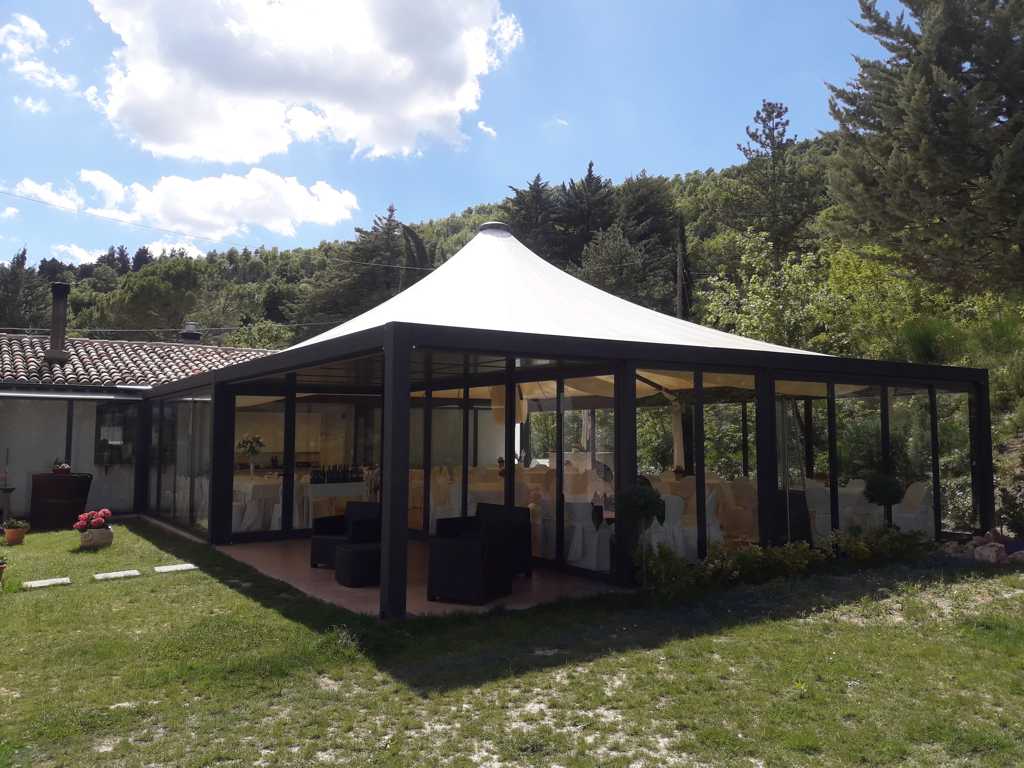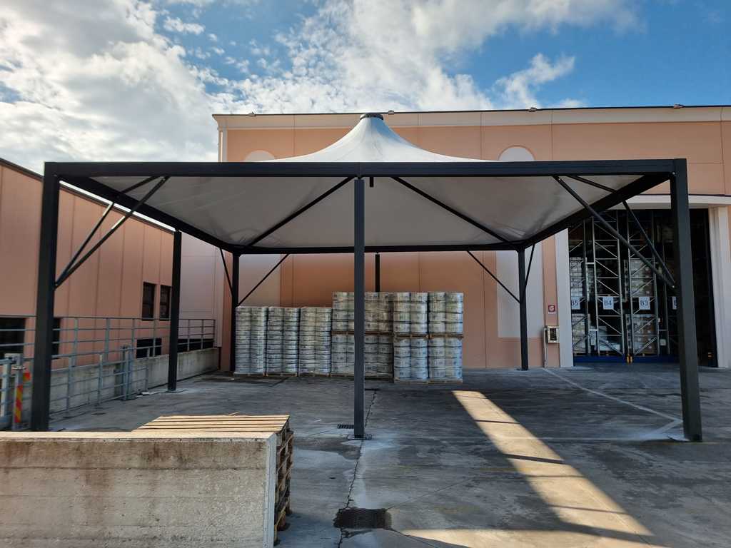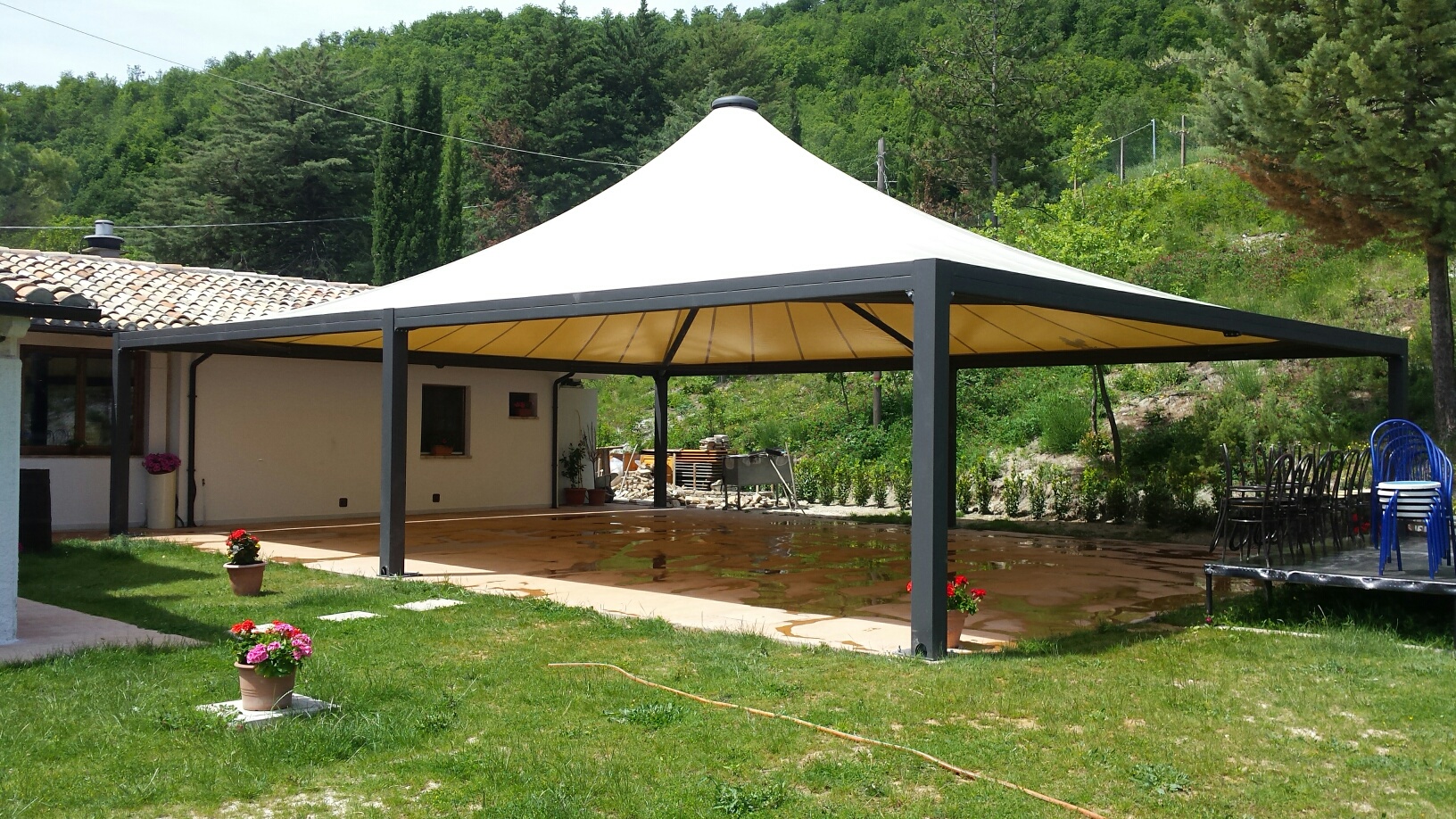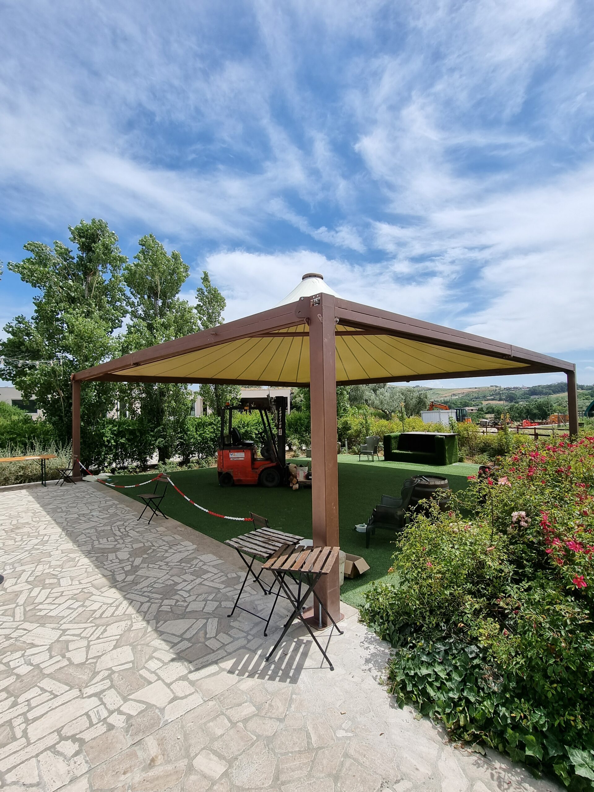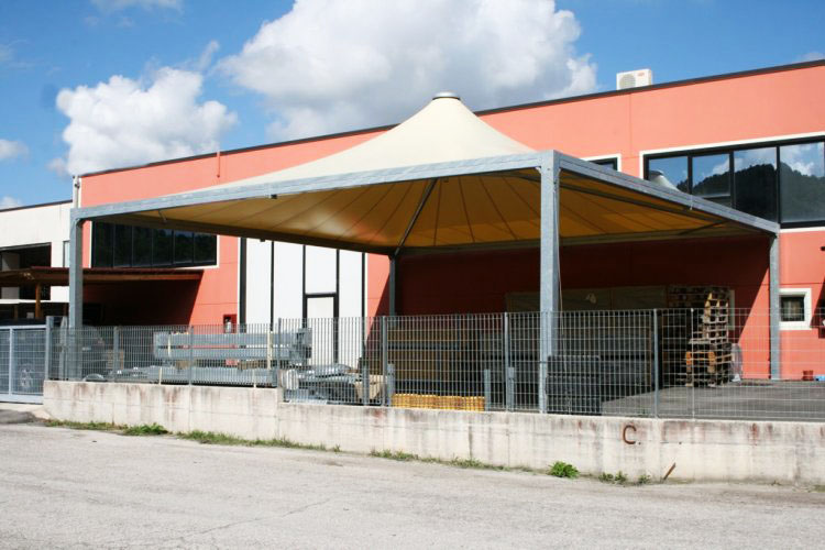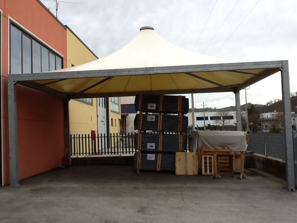 Copertura in tessuto PVC alta resistenza a forma piramidale , con messa in tensione mediante sistema a pressione posto sulla sommità.