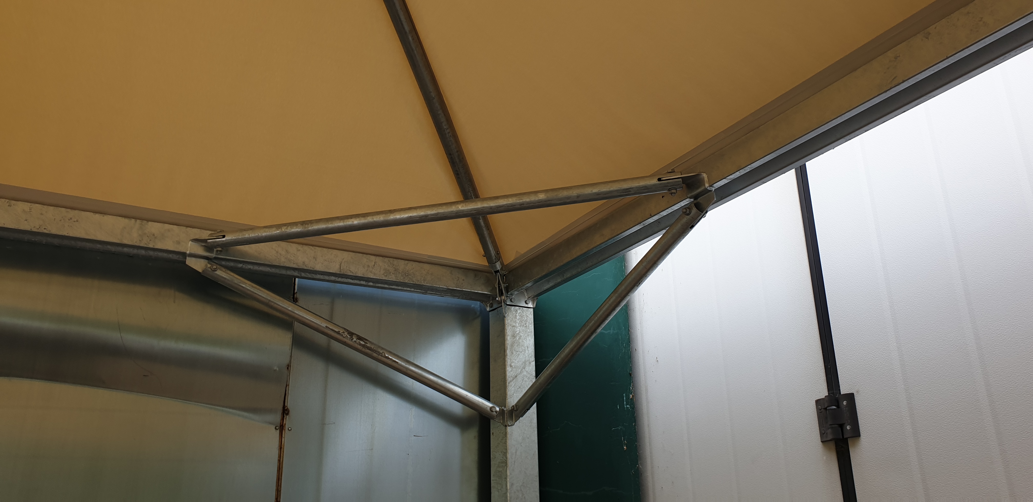 Rivoluzionario sistema di raccolta acqua sui piantoni, che fungono anche pluviali per l’acqua, mentre il trave superiore funge da grondaia raccolta acqua.